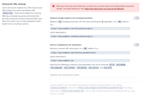 Our URL cleanup feature allows you to automatically remove all unknown query parameters. When you enable this feature, we’ll trigger a redirect to strip out parameters that you haven’t explicitly said that you want to keep. For example, requests to example.com/?nonsense=true will now automatically redirect to example.com (via a 301 redirect).