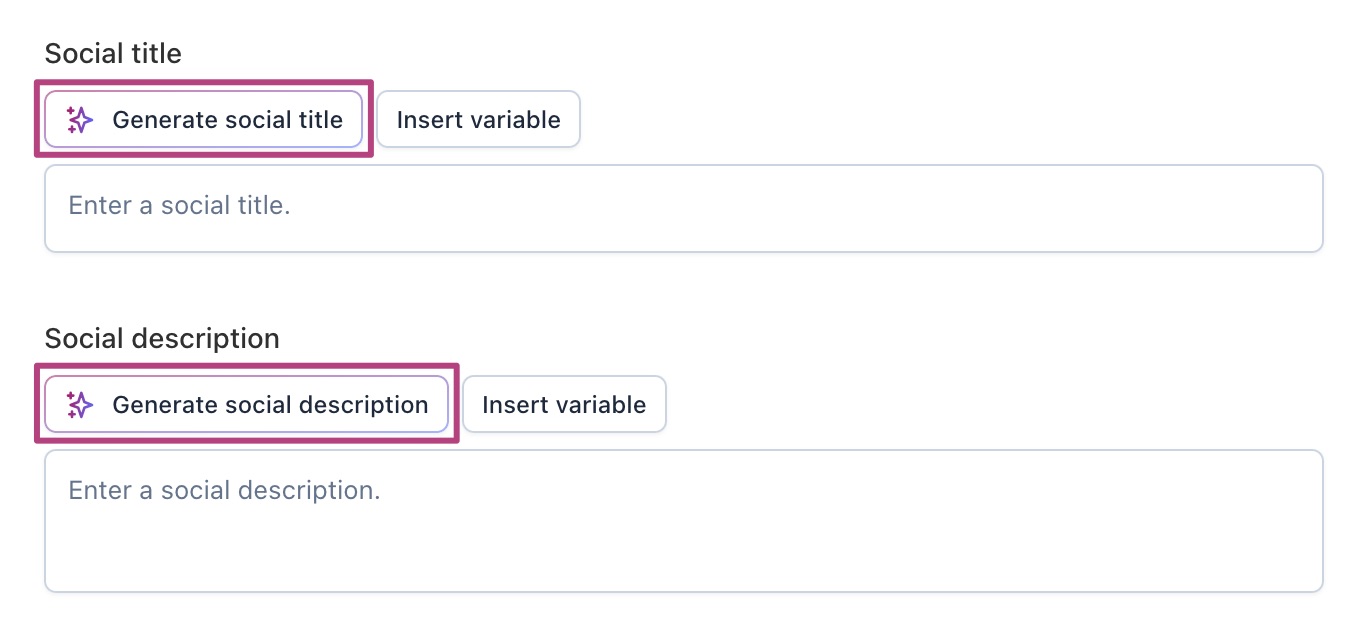 For Search appearance, the button will read Generate Shopify SEO Title or Generate Shopify meta description. For Social media appearance, the button will read Generate social title or Generate social description.