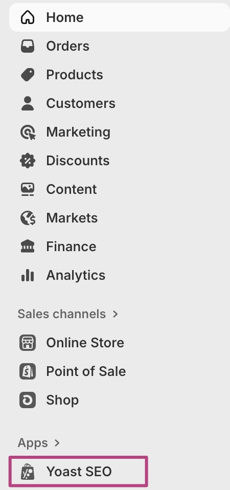 - Log in to Shopify and go to the Yoast SEO app