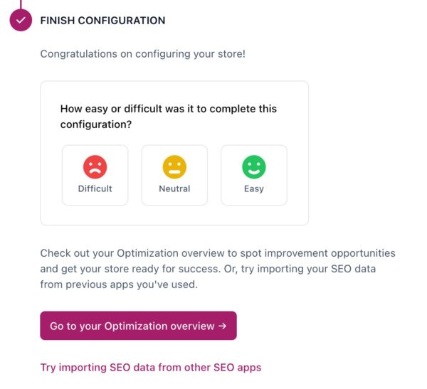 The last step is finishing the First-time configuration. Here, you can immediately go to your optimization overview, or import SEO data from other SEO apps.