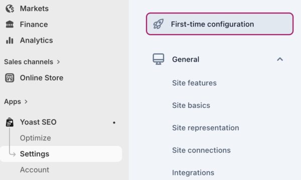 You will be asked to the complete the First-time configuration immediately after installing the app. If you do not the complete First-time configuration, you can also access it under the Yoast SEO Settings.