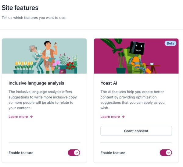 Under Site features, enable the Inclusive language analysis and Yoast AI features.