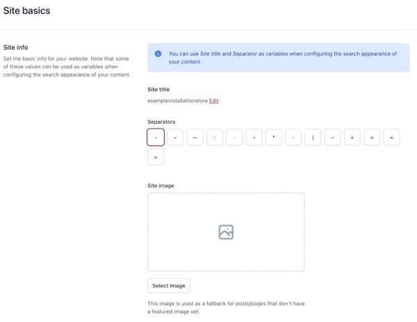 Under Site basics, set the Site title, Separators and Site images. This sets a default template for your site’s appearance in search engine results.