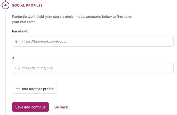By filling in the Social profiles, Yoast SEO can build out your store’s social media. The standard options are Facebook and X, but you can also add profiles from platforms like Instagram, YouTube, LinkedIn, Pinterest and more.