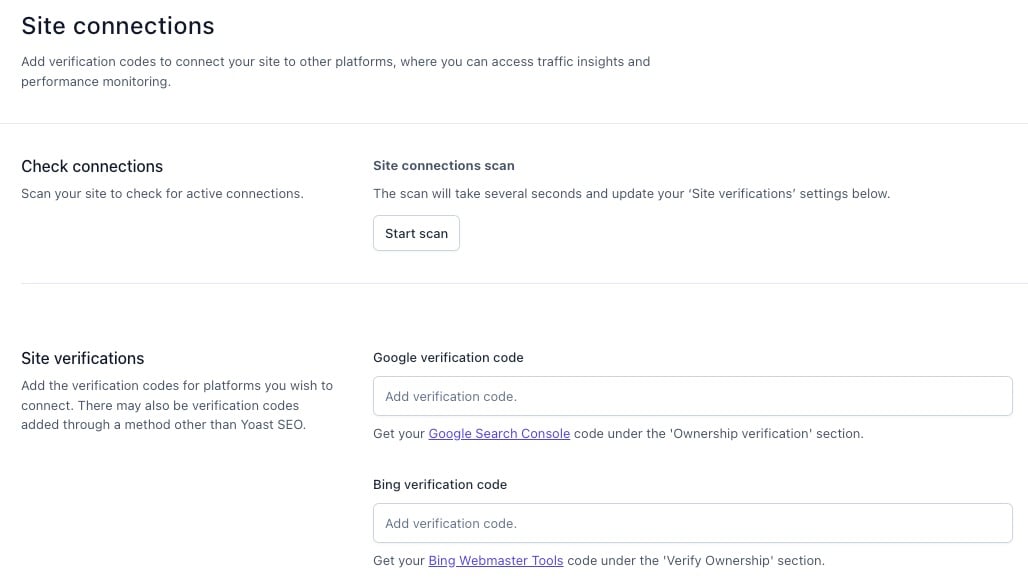 The site connections settings let you verify your site with different webmaster tools by clicking Start scan. With webmaster tools, you can see your site’s performance in search engine results and how to improve it.
