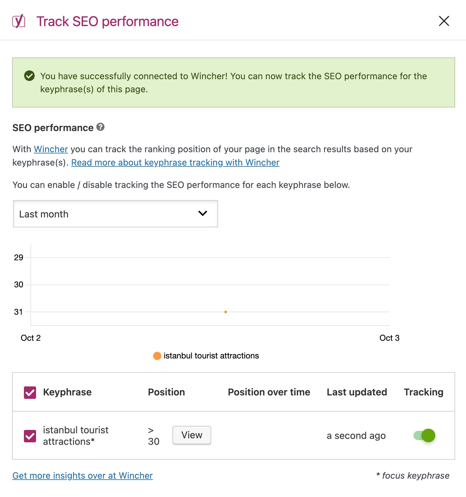 Wincher in Yoast SEO makes it possible to track the ranking positions of your keywords easily. Using the new keyphrase performance tracker, you’ll better understand how your posts rank over time. Knowing where you stand in the search results will let you discover if your content works. You’ll see if the improvements to your content have an effect and if you are on your way to outrank your competitors! In this article, we’ll explain how to use the Wincher keyphrase performance tracker integration in Yoast SEO.