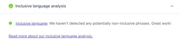 Yoast SEO also offers the Inclusive language analysis, which is opt-in. By using inclusive language you open up your content to more people, improving your visibility. In addition, by using language that avoids biases and discriminatory terms, you will get a chance to rank higher.