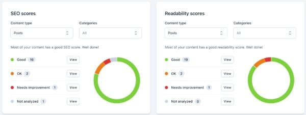 The Dashboard provides an overview of how optimized your content is. You can see your SEO and Readability scores of your Posts, Pages and Products. If you have enabled the Site Kit integration, you also get more data about your content’s performance in search engine results.