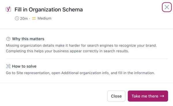 If you click on the task, you’ll see an explanation of why this task matters, as well as instructions on how to complete the task. You can also go to the task directly by clicking the purple button. The tasks differ, depending on your content, configuration, and whether you have Yoast SEO Premium.