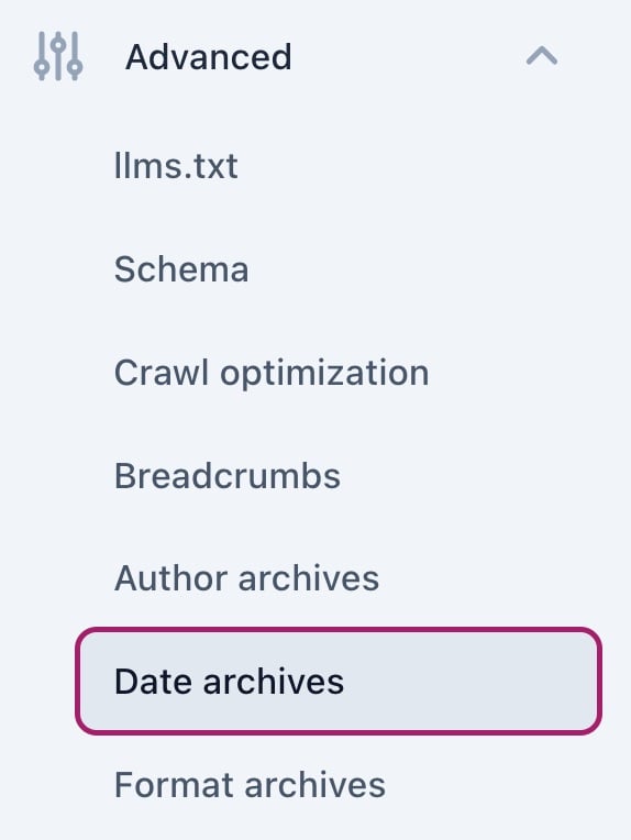 You can enable or disable date archives on your site. We recommend disabling date archives, because posts in these archives are usually not connected to each other and may cause duplicante content issues. If you do enable date archives, you can set a Search appearance and Social media appearance.