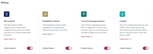 The inclusive language analysis offers suggestions for writing more inclusive copy. If you write more inclusively, you will open up your content to more people. This feature is opt-in, so it’s disabled by default. If you want to enable this analysis, you can do that by switching the toggle on this page. Read more on the importance of inclusive language for SEO and the categories the inclusive language analysis assesses.
