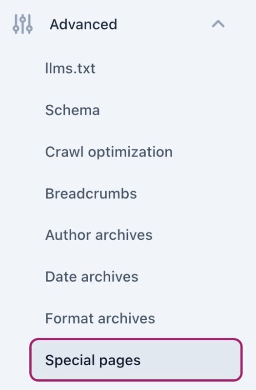 Yoast SEO settings: Special pages