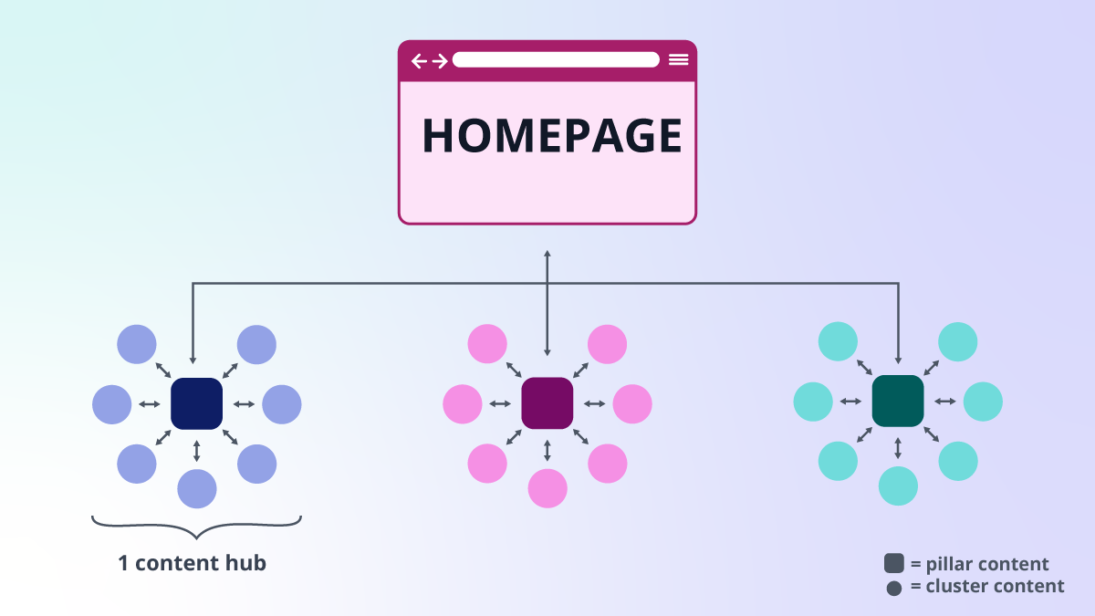 Think of your website like a pyramid or, more effectively, a content hub model or content cluster. At the top sits a broad, high-value pillar page that targets a main keyword or topic, supported by cluster pages that explore related subtopics in more depth.