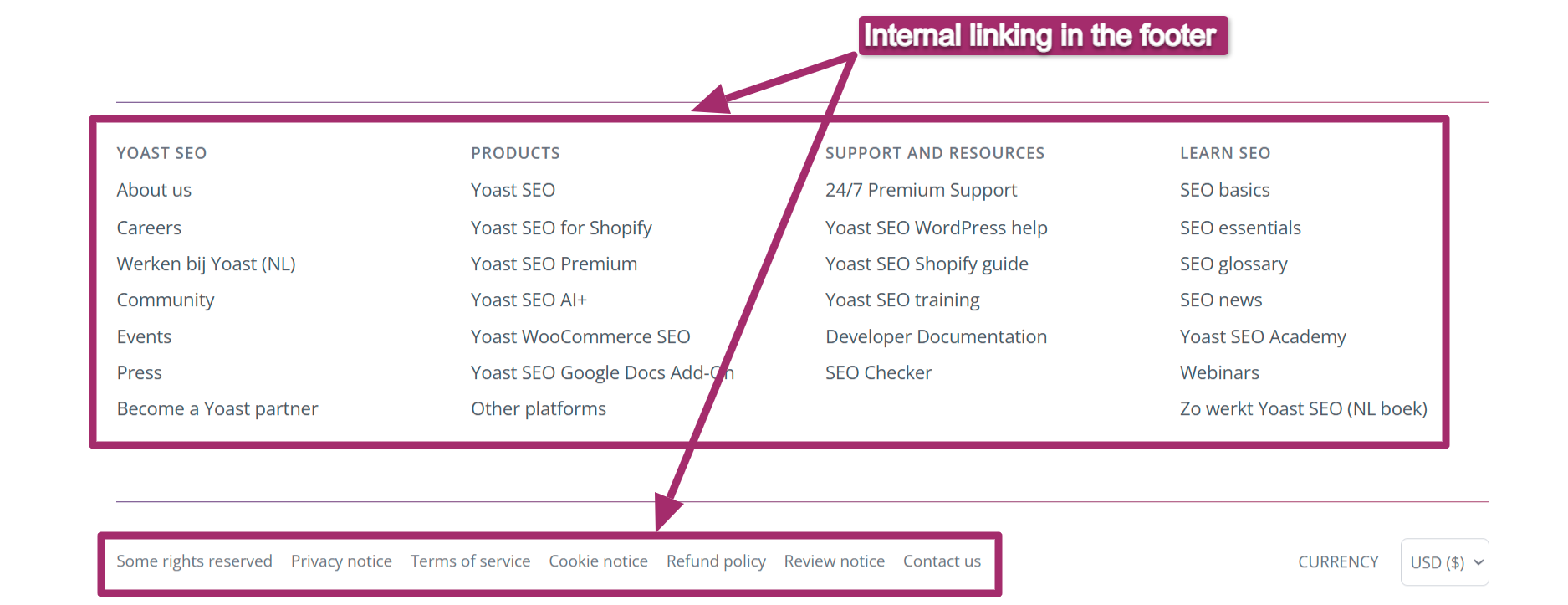 Footer links appear at the bottom of your web pages. They usually lead to important informational or legal pages such as your privacy policy, terms of service, or sitemap. While they may not hold as much SEO weight as contextual links, they still contribute to your site’s overall crawlability and accessibility.