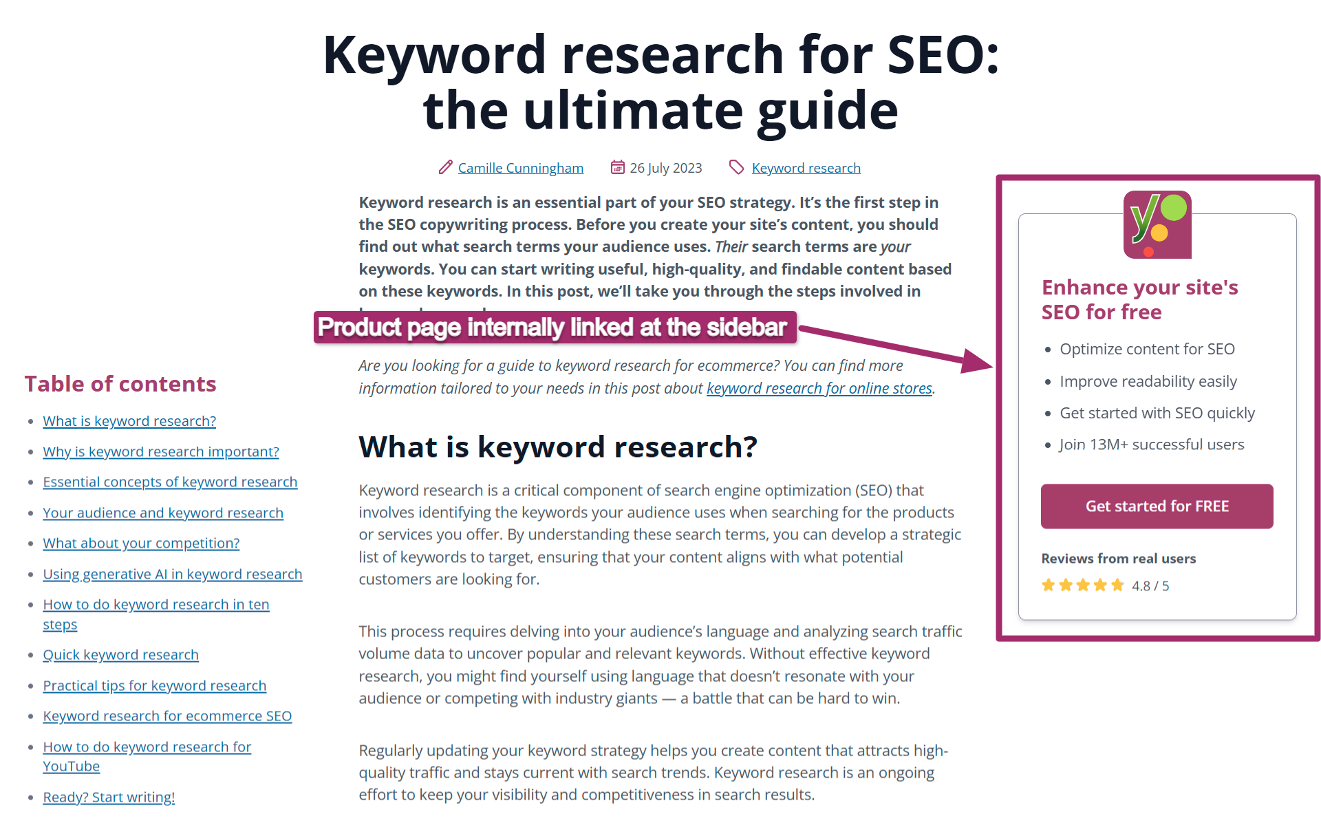 So, we’ve added links from other relevant articles, such as ‘7 keyword research mistakes to avoid‘, ‘ What is keyword research‘, or ‘Focus on long tail keywords‘, to the main article. We link back to these posts from the main article. In doing so, Google will understand that the ultimate guide contains the most information about [keyword research]. Ultimately, Google will rank the guide above the other shorter posts about keyword research.