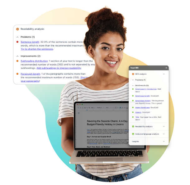 With the Yoast SEO Google Docs add-on, you get instant analysis on SEO, readability, and inclusivity as you write. There’s no need to switch platforms or check Yoast SEO on your CMS for feedback.